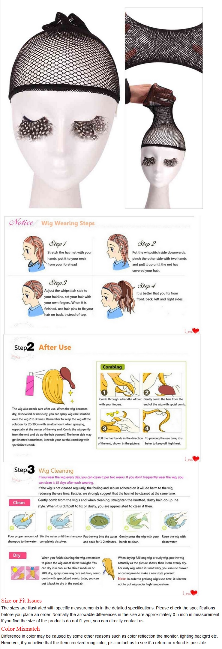 It is recommended to fluff and run fingers through wig to get out loose fibers before wearing. Teasing it can create a cute fluffy style. Bangs may need to be trimmed to suit your own face.. Wig net has two elastic belts built in to shorten the circumference ifnecessary.
